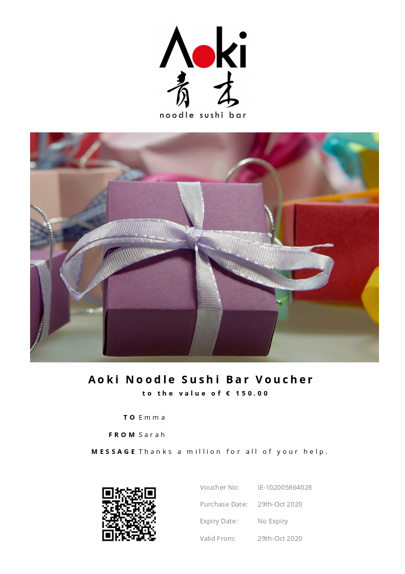 Aoki Noodle Sushi Bar allows you to purchase instantly printable gift vouchers, special offers and tickets using the Voucher Connect platform.